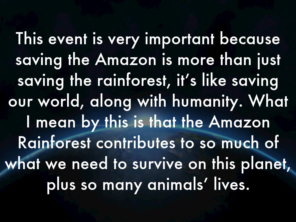 This event is very important because saving the Amazon is more than just saving the rainforest, it’s like saving our world, along with humanity. What I mean by this is that the Amazon Rainforest contributes to so much of what we need to survive on this planet, plus so many animals’ lives.