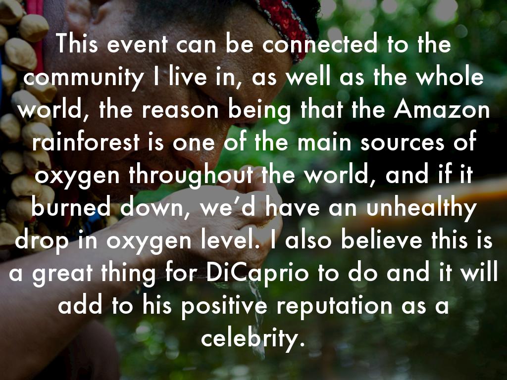 This event can be connected to the community I live in, as well as the whole world, the reason being that the Amazon rainforest is one of the main sources of oxygen throughout the world, and if it burned down, we’d have an unhealthy drop in oxygen level. I also believe this is a great thing for DiCaprio to do and it will add to his positive reputation as a celebrity.
