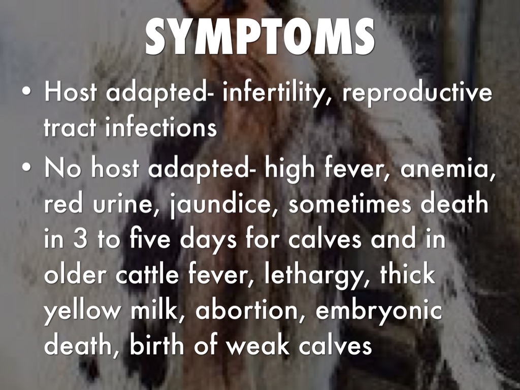 No host adapted- high fever, anemia, red urine, jaundice, sometimes death in 3 to five days for calves and in older cattle fever, lethargy, thick yellow milk, abortion, embryonic death, birth of weak calves