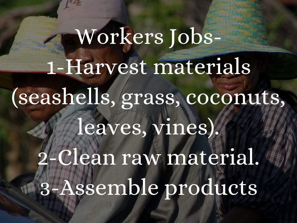 Produces Seashell necklaces, tiki cups, coconut bras, and grass skirts.