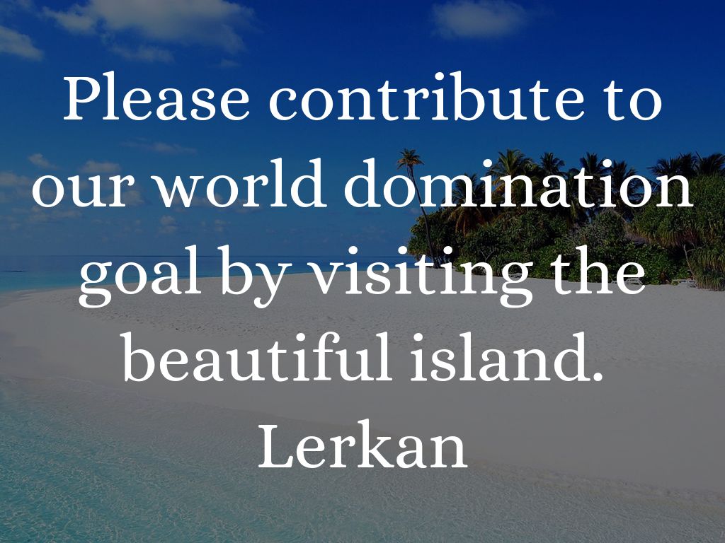 Please contribute to our world domination goal by visiting the beautiful island. Lerkan