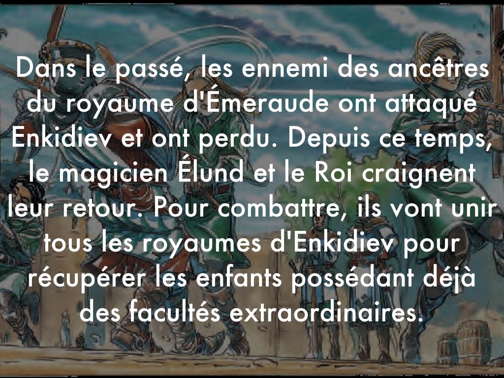 Dans le passé, les ennemi des ancêtres du royaume d'Émeraude ont attaqué Enkidiev et ont perdu. Depuis ce temps, le magicien Élund et le Roi craignent leur retour. Pour combattre, ils vont unir tous les royaumes d'Enkidiev pour récupérer les enfants possédant déjà des facultés extraordinaires.