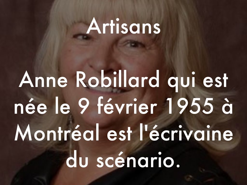 Anne Robillard qui est née le 9 février 1955 à Montréal est l'écrivaine du scénario.