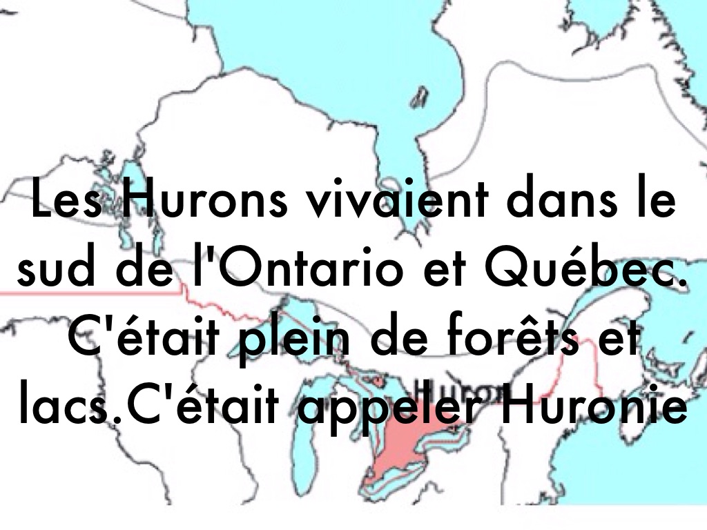 Les Hurons vivaient dans le sud de l'Ontario et Québec. C'était plein de forêts et lacs.C'était appeler Huronie
