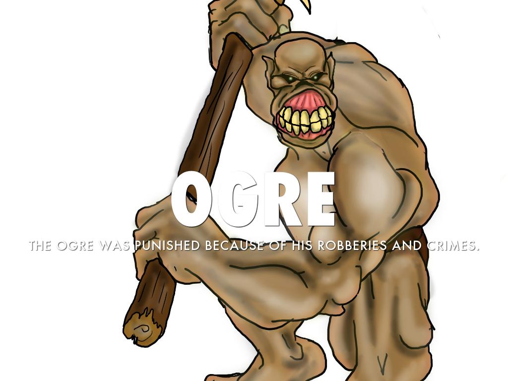 THE OGRE WAS PUNISHED BECAUSE OF HIS ROBBERIES AND CRIMES.