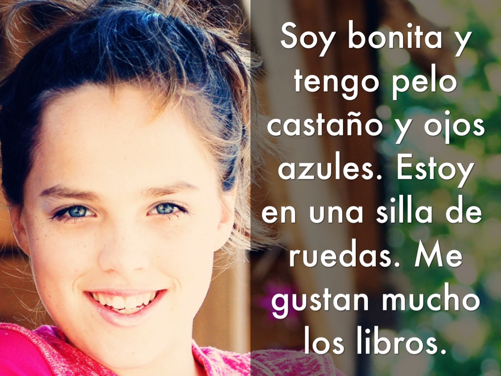 Soy bonita y tengo pelo castaño y ojos azules. Estoy en una silla de ruedas. Me gustan mucho los libros.