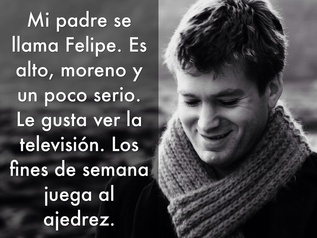 Mi padre se llama Felipe. Es alto, moreno y un poco serio. Le gusta ver la televisión. Los fines de semana juega al ajedrez.