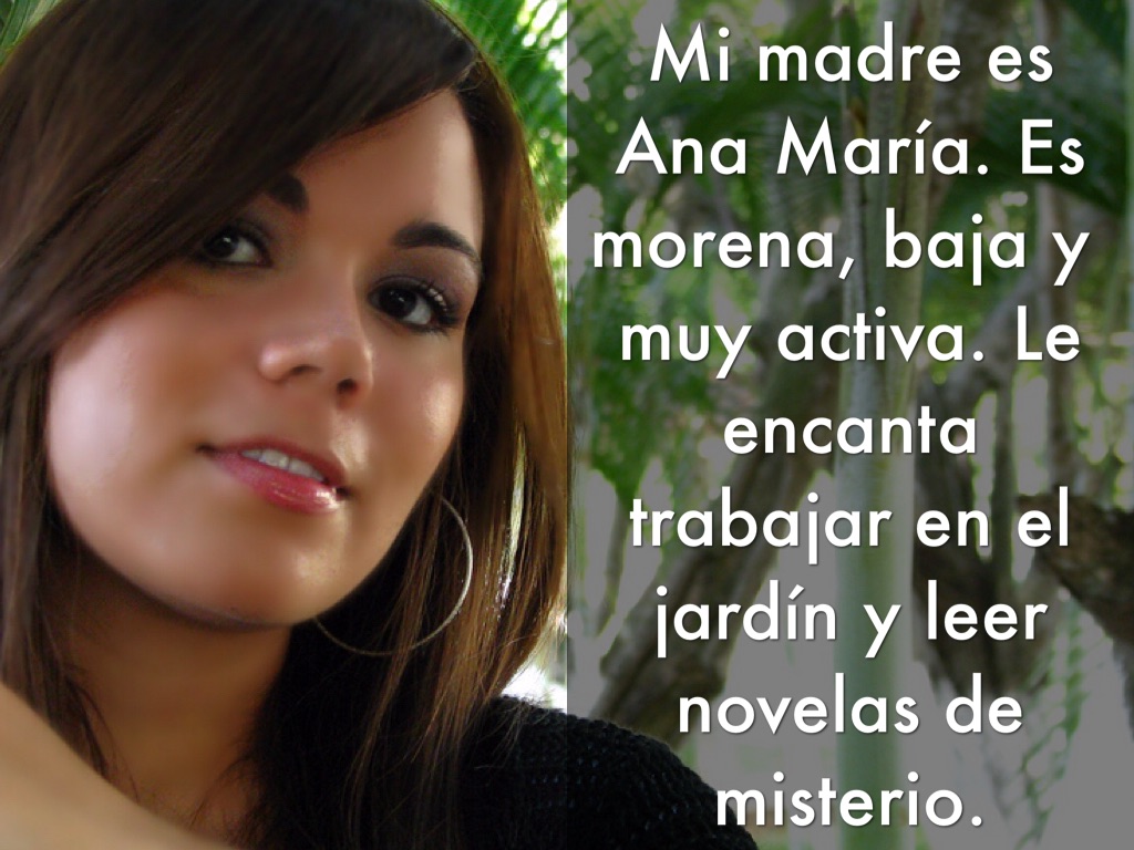Mi madre es Ana María. Es morena, baja y muy activa. Le encanta trabajar en el jardín y leer novelas de misterio.