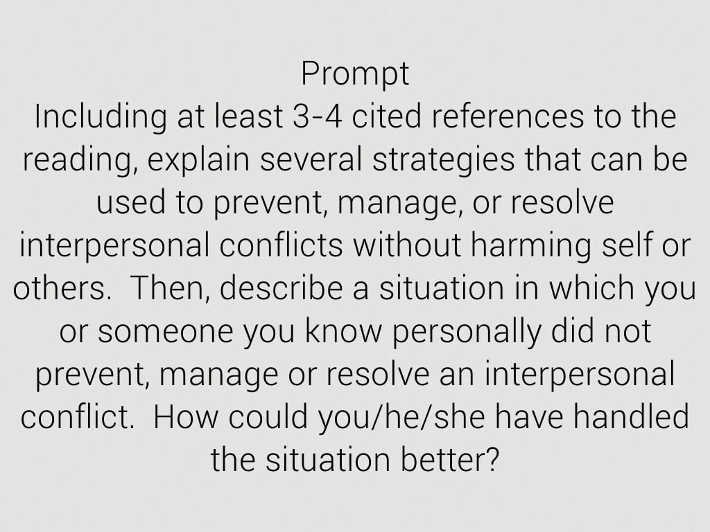 Including at least 3-4 cited references to the reading, explain several strategies that can be used to prevent, manage, or resolve interpersonal conflicts without harming self or others. Then, describe a situation in which you or someone you know personally did not prevent, manage or resolve an interpersonal conflict. How could you/he/she have handled the situation better?