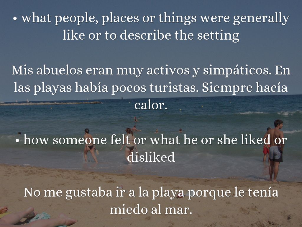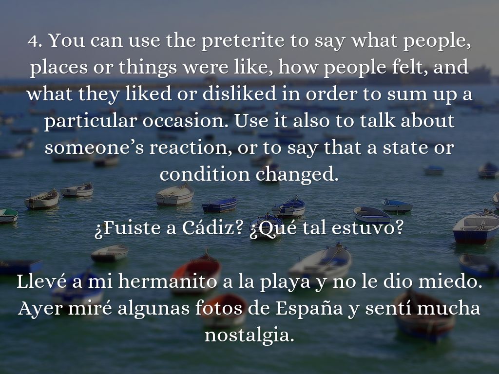 4. You can use the preterite to say what people, places or things were like, how people felt, and what they liked or disliked in order to sum up a particular occasion. Use it also to talk about someone’s reaction, or to say that a state or condition changed.