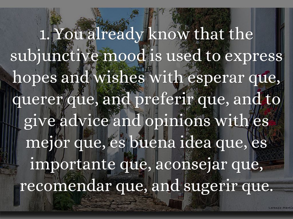 1. You already know that the subjunctive mood is used to express hopes and wishes with esperar que, querer que, and preferir que, and to give advice and opinions with es mejor que, es buena idea que, es importante que, aconsejar que, recomendar que, and sugerir que.