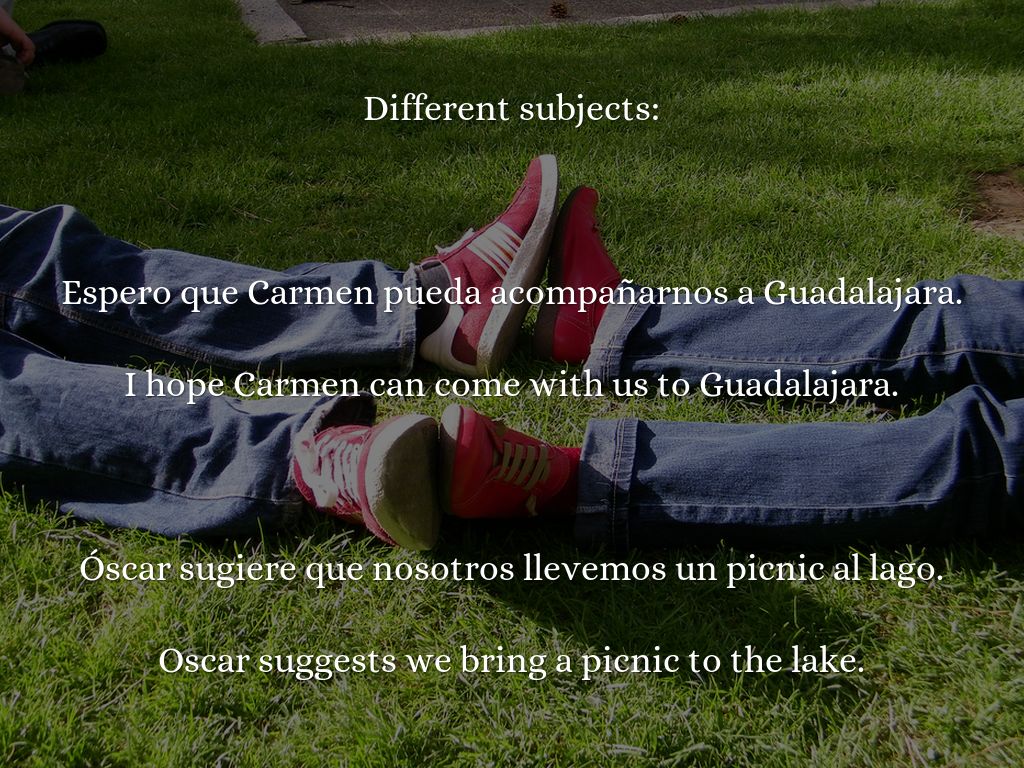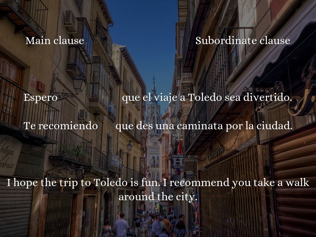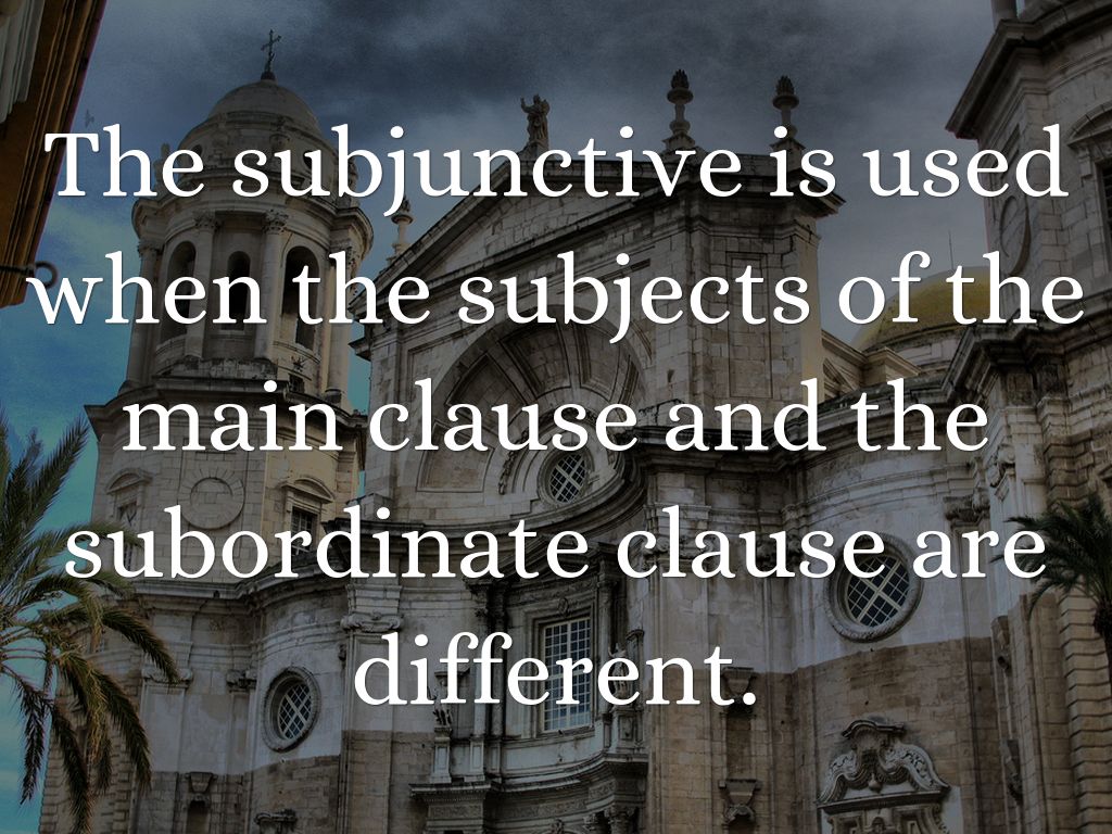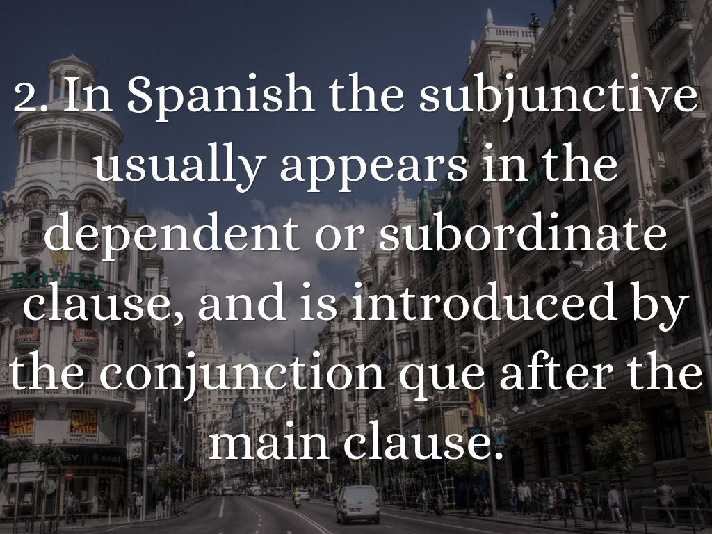 2. In Spanish the subjunctive usually appears in the dependent or subordinate clause, and is introduced by the conjunction que after the main clause.