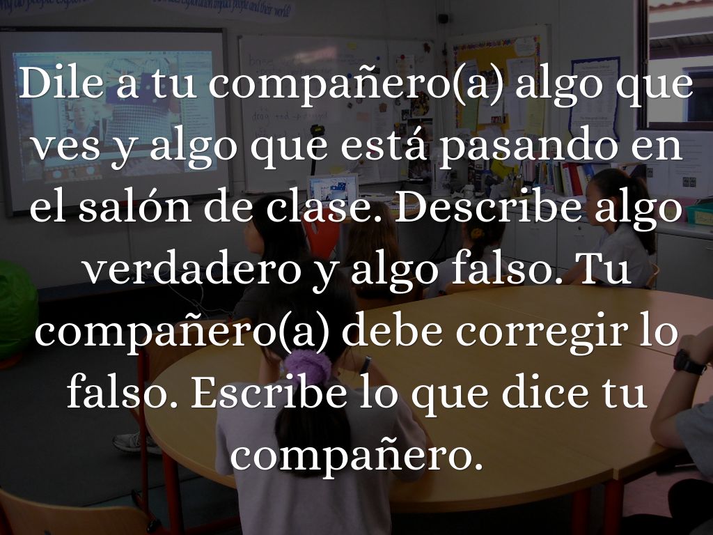 Dile a tu compañero(a) algo que ves y algo que está pasando en el salón de clase. Describe algo verdadero y algo falso. Tu compañero(a) debe corregir lo falso. Escribe lo que dice tu compañero.