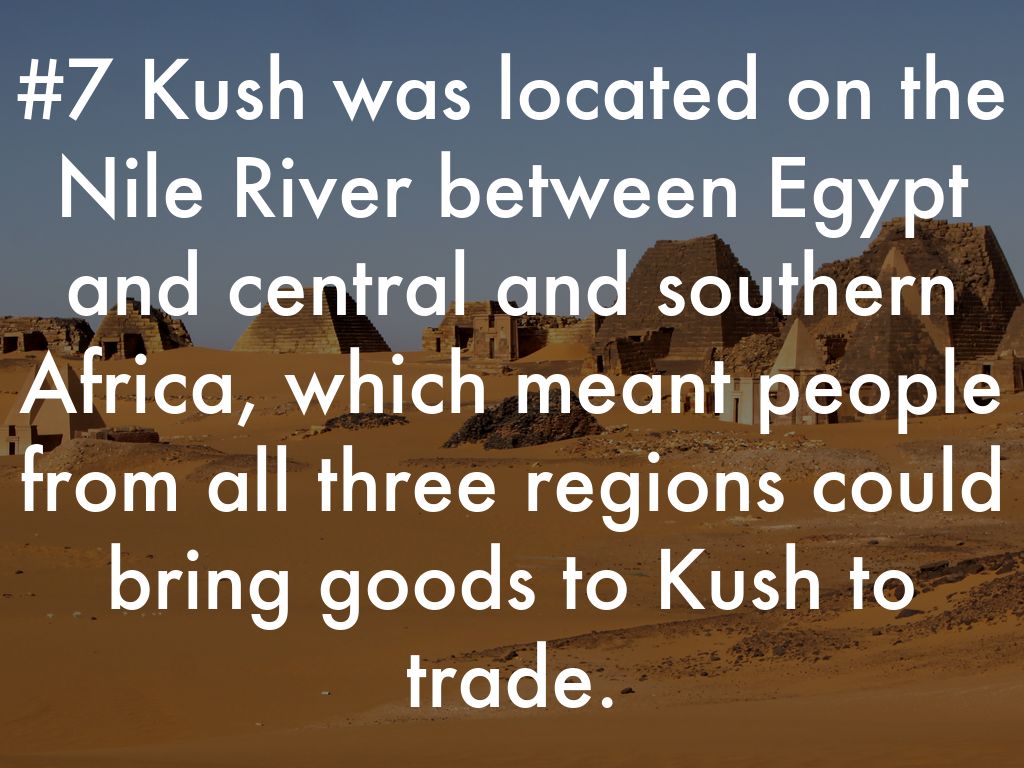 #7 Kush was located on the Nile River between Egypt and central and southern Africa, which meant people from all three regions could bring goods to Kush to trade.