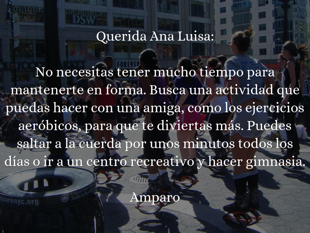 No necesitas tener mucho tiempo para mantenerte en forma. Busca una actividad que puedas hacer con una amiga, como los ejercicios aeróbicos, para que te diviertas más. Puedes saltar a la cuerda por unos minutos todos los días o ir a un centro recreativo y hacer gimnasia.