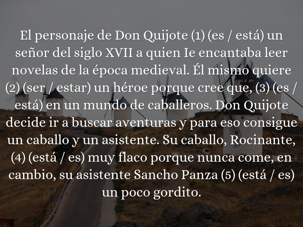 El personaje de Don Quijote (1) (es / está) un señor del siglo XVII a quien Ie encantaba leer novelas de la época medieval. Él mismo quiere (2) (ser / estar) un héroe porque cree que, (3) (es / está) en un mundo de caballeros. Don Quijote decide ir a buscar aventuras y para eso consigue un caballo y un asistente. Su caballo, Rocinante, (4) (está / es) muy flaco porque nunca come, en cambio, su asistente Sancho Panza (5) (está / es) un poco gordito.