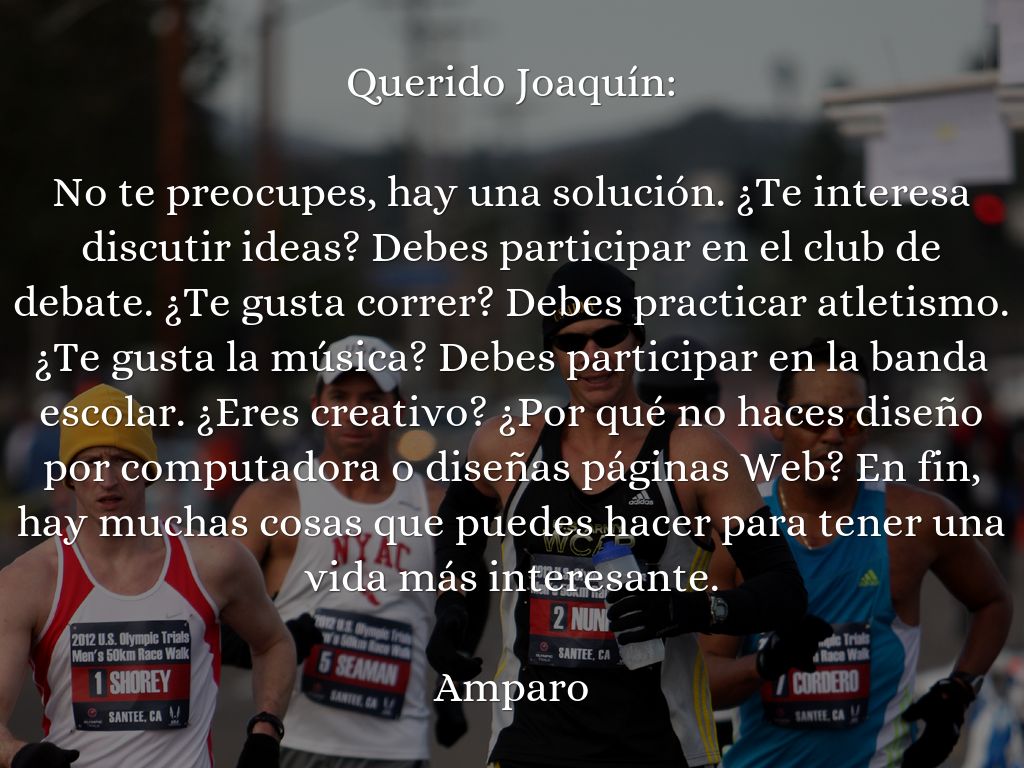 No te preocupes, hay una solución. ¿Te interesa discutir ideas? Debes participar en el club de debate. ¿Te gusta correr? Debes practicar atletismo. ¿Te gusta la música? Debes participar en la banda escolar. ¿Eres creativo? ¿Por qué no haces diseño por computadora o diseñas páginas Web? En fin, hay muchas cosas que puedes hacer para tener una vida más interesante.