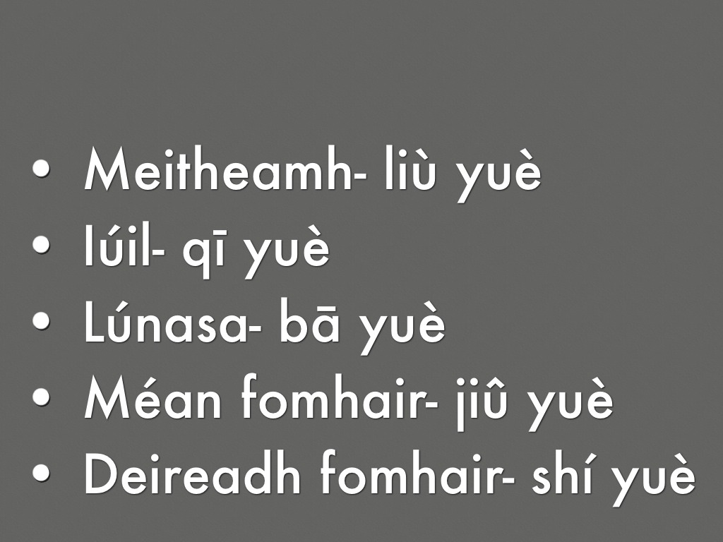 Leis na míosa cuireann tú uimhreacha 1-12 roimh yuè.