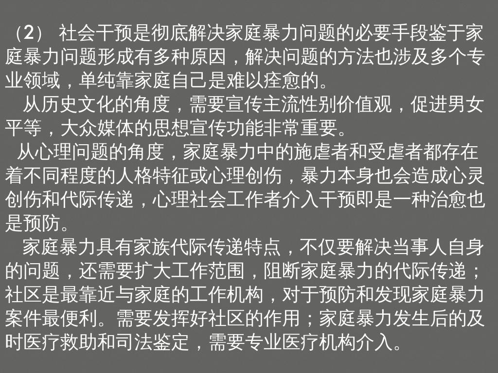 (2) 社会干预是彻底解决家庭暴力问题的必要手段鉴于家庭暴力问题形成有多种原因,解决问题的方法也涉及多个专业领域,单纯靠家庭自己是难以痊愈的。
