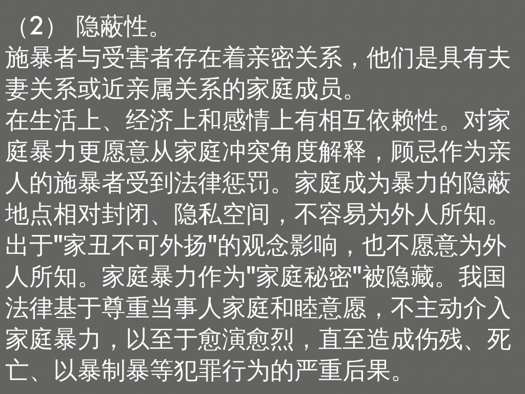 在生活上、经济上和感情上有相互依赖性。对家庭暴力更愿意从家庭冲突角度解释,顾忌作为亲人的施暴者受到法律惩罚。家庭成为暴力的隐蔽地点相对封闭、隐私空间,不容易为外人所知。出于"家丑不可外扬"的观念影响,也不愿意为外人所知。家庭暴力作为"家庭秘密"被隐藏。我国法律基于尊重当事人家庭和睦意愿,不主动介入家庭暴力,以至于愈演愈烈,直至造成伤残、死亡、以暴制暴等犯罪行为的严重后果。