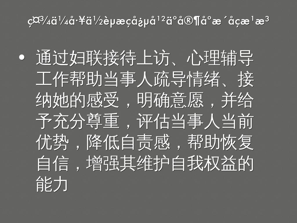 • 通过妇联接待上访、心理辅导工作帮助当事人疏导情绪、接纳她的感受,明确意愿,并给予充分尊重,评估当事人当前优势,降低自责感,帮助恢复自信,增强其维护自我权益的能力
