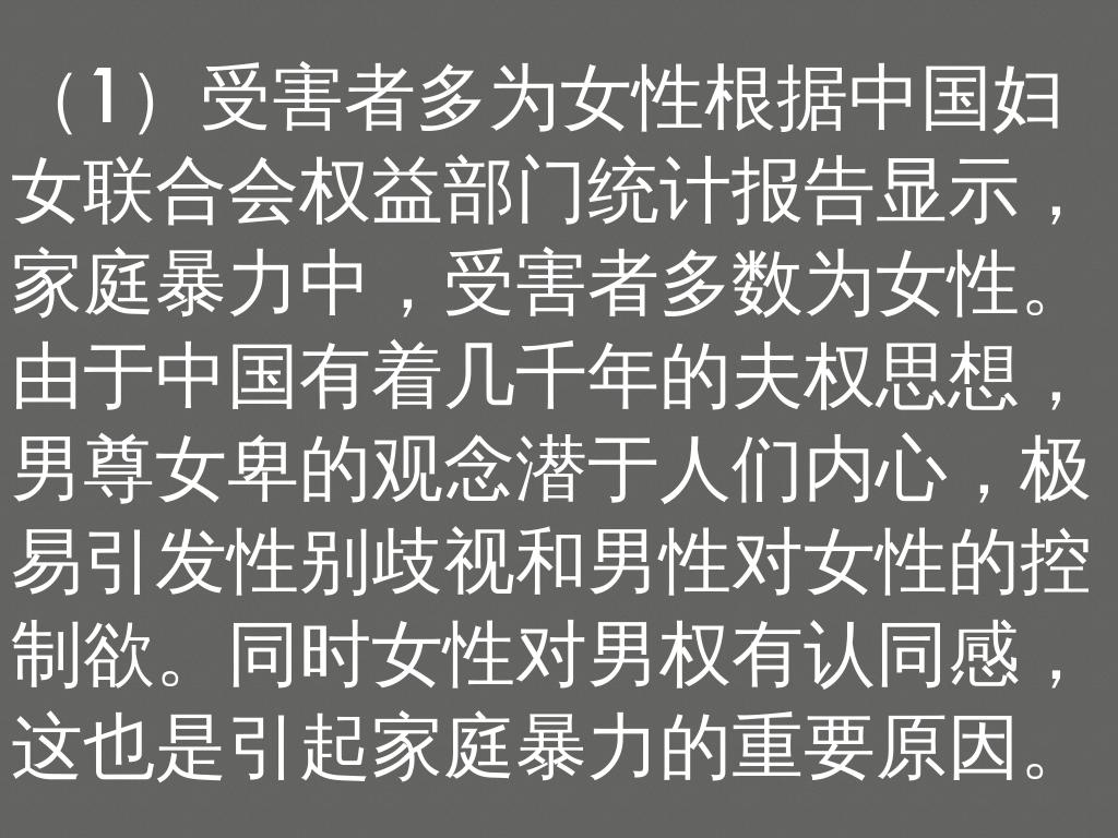 (1)受害者多为女性根据中国妇女联合会权益部门统计报告显示,家庭暴力中,受害者多数为女性。由于中国有着几千年的夫权思想,男尊女卑的观念潜于人们内心,极易引发性别歧视和男性对女性的控制欲。同时女性对男权有认同感,这也是引起家庭暴力的重要原因。