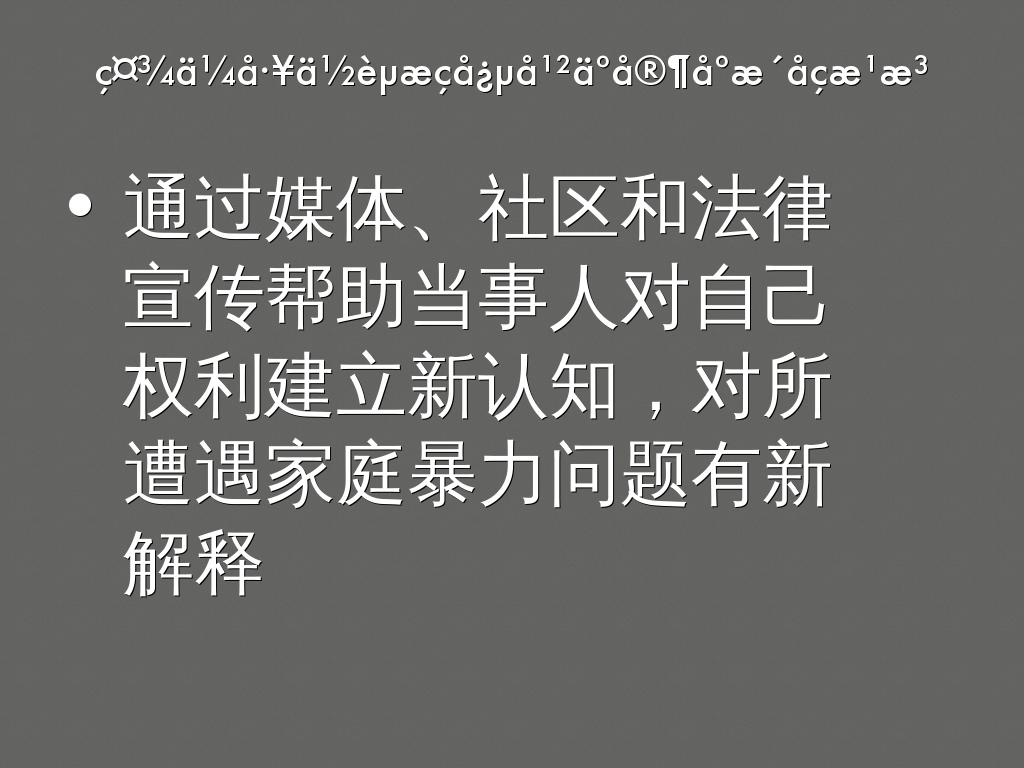 • 通过媒体、社区和法律宣传帮助当事人对自己权利建立新认知,对所遭遇家庭暴力问题有新解释