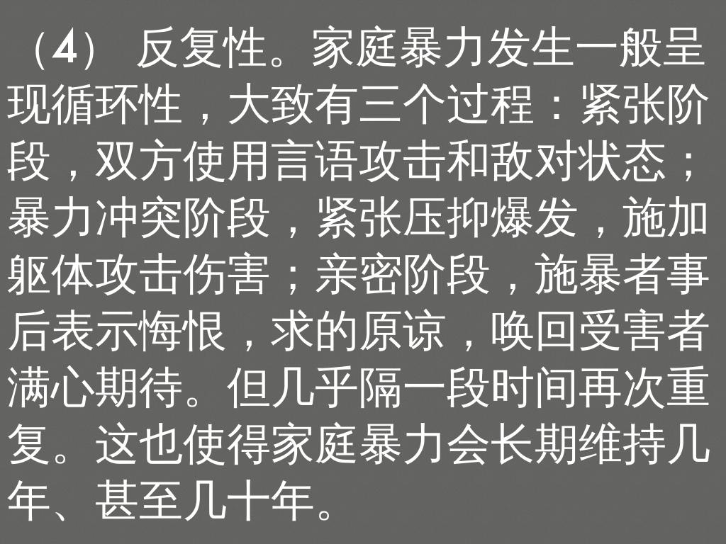 (4) 反复性。家庭暴力发生一般呈现循环性,大致有三个过程:紧张阶段,双方使用言语攻击和敌对状态;暴力冲突阶段,紧张压抑爆发,施加躯体攻击伤害;亲密阶段,施暴者事后表示悔恨,求的原谅,唤回受害者满心期待。但几乎隔一段时间再次重复。这也使得家庭暴力会长期维持几年、甚至几十年。