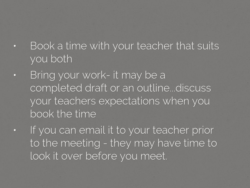 • Bring your work- it may be a completed draft or an outline...discuss your teachers expectations when you book the time