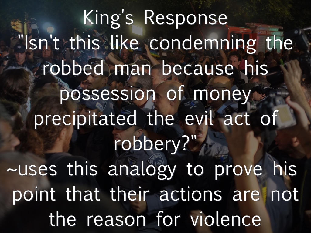 Accusing King and rest of black community for being irresponsible for breaking the law.