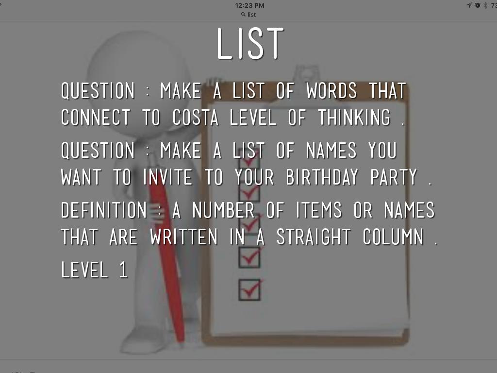 Question : Make a list of words that connect to costa level of thinking .
