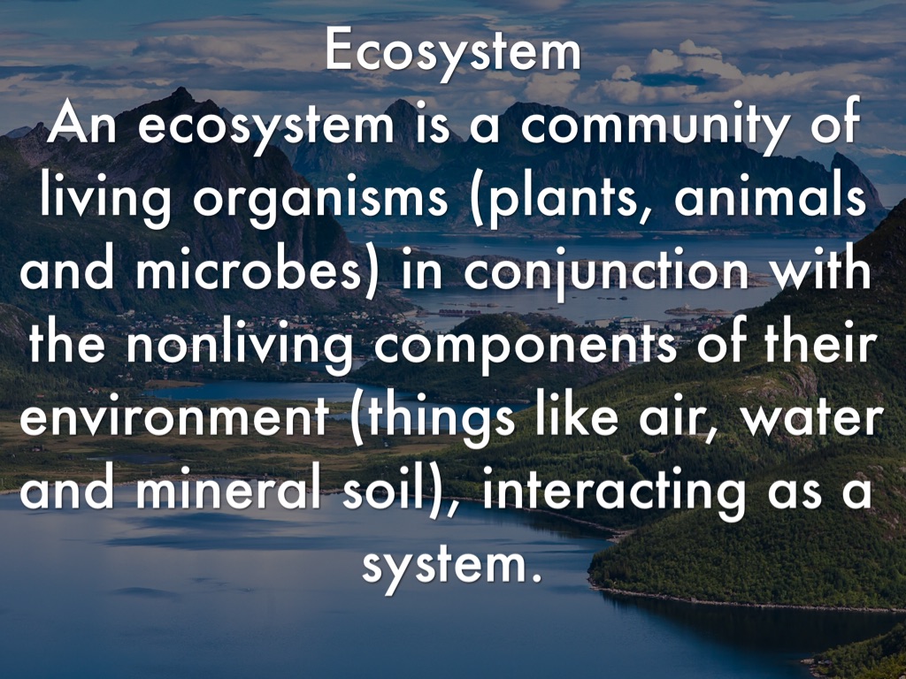 Ecosystem An ecosystem is a community of living organisms (plants, animals and microbes) in conjunction with the nonliving components of their environment (things like air, water and mineral soil), interacting as a system.