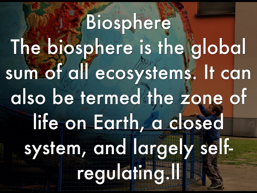 Biosphere The biosphere is the global sum of all ecosystems. It can also be termed the zone of life on Earth, a closed system, and largely self-regulating.ll