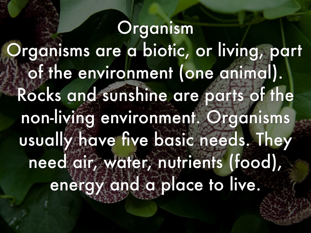 Organism Organisms are a biotic, or living, part of the environment (one animal). Rocks and sunshine are parts of the non-living environment. Organisms usually have five basic needs. They need air, water, nutrients (food), energy and a place to live.