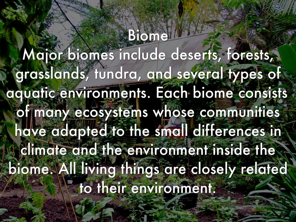 Biome Major biomes include deserts, forests, grasslands, tundra, and several types of aquatic environments. Each biome consists of many ecosystems whose communities have adapted to the small differences in climate and the environment inside the biome. All living things are closely related to their environment.