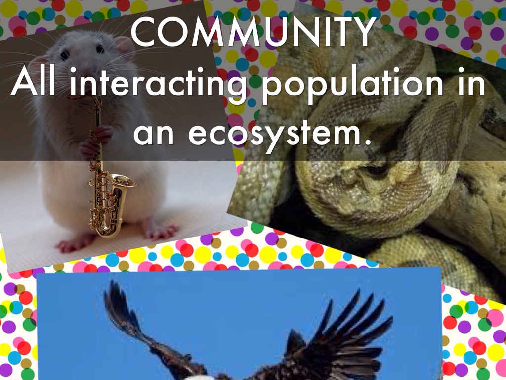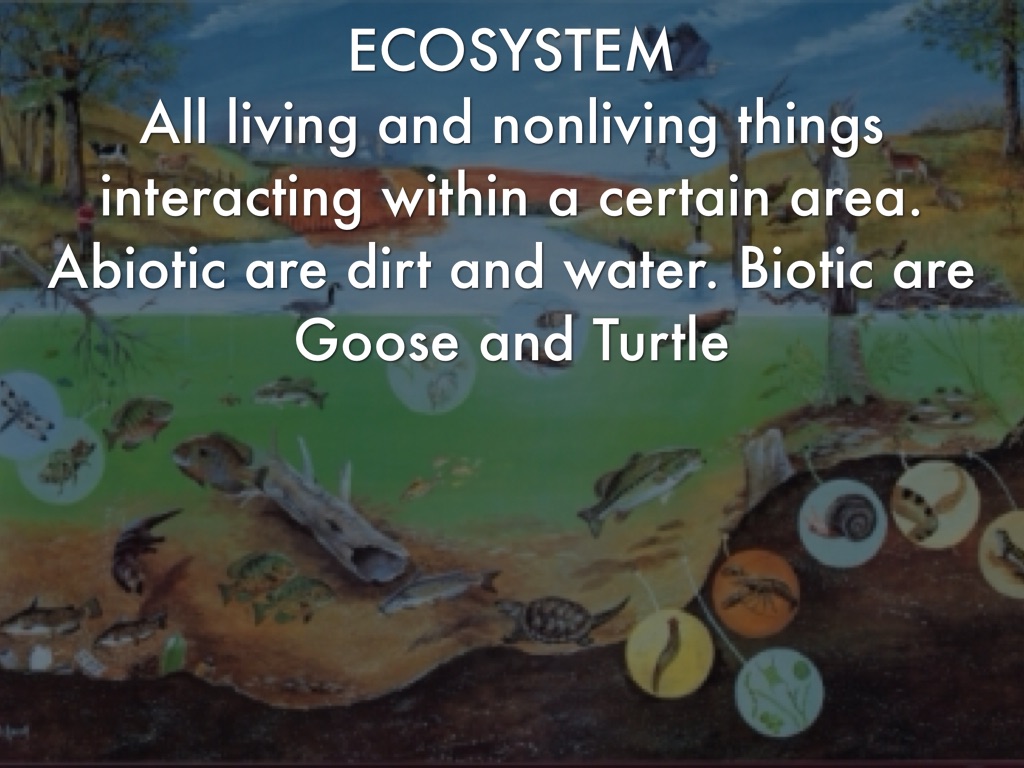 All living and nonliving things interacting within a certain area. Abiotic are dirt and water. Biotic are Goose and Turtle