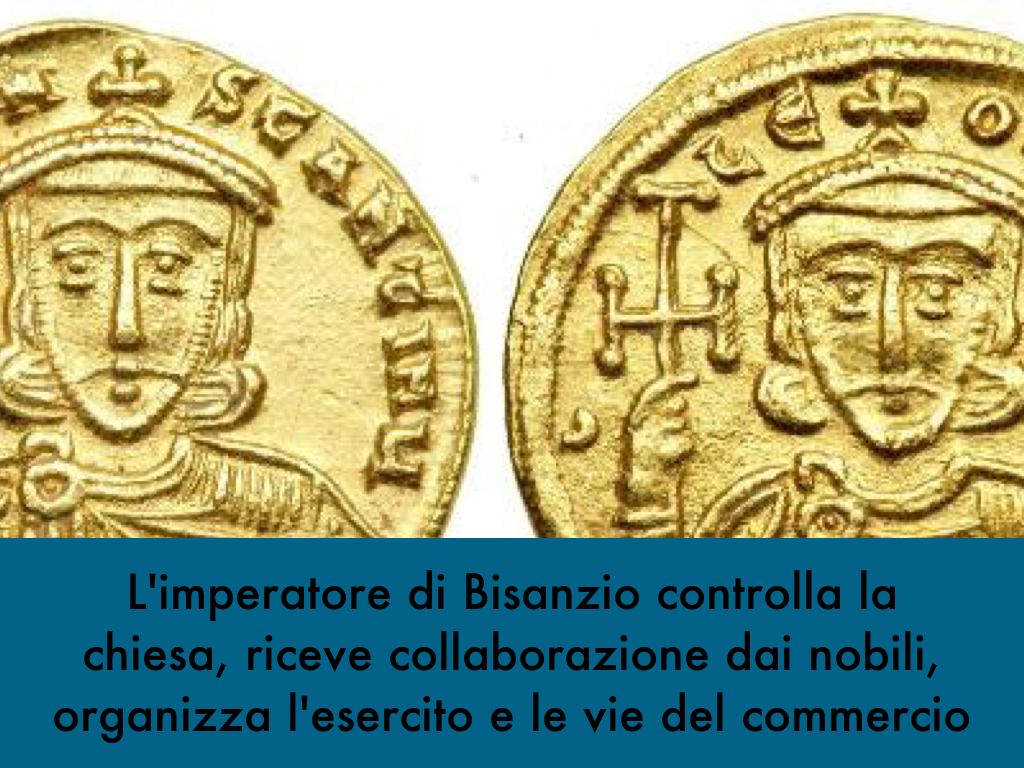 L'imperatore di Bisanzio controlla la chiesa, riceve collaborazione dai nobili, organizza l'esercito e le vie del commercio