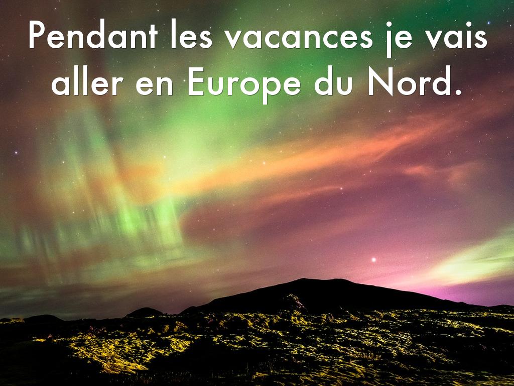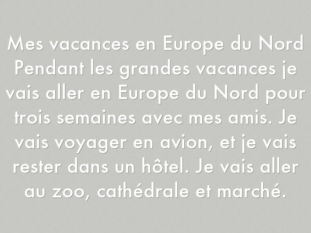 Pendant les grandes vacances je vais aller en Europe du Nord pour trois semaines avec mes amis. Je vais voyager en avion, et je vais rester dans un hôtel. Je vais aller au zoo, cathédrale et marché.