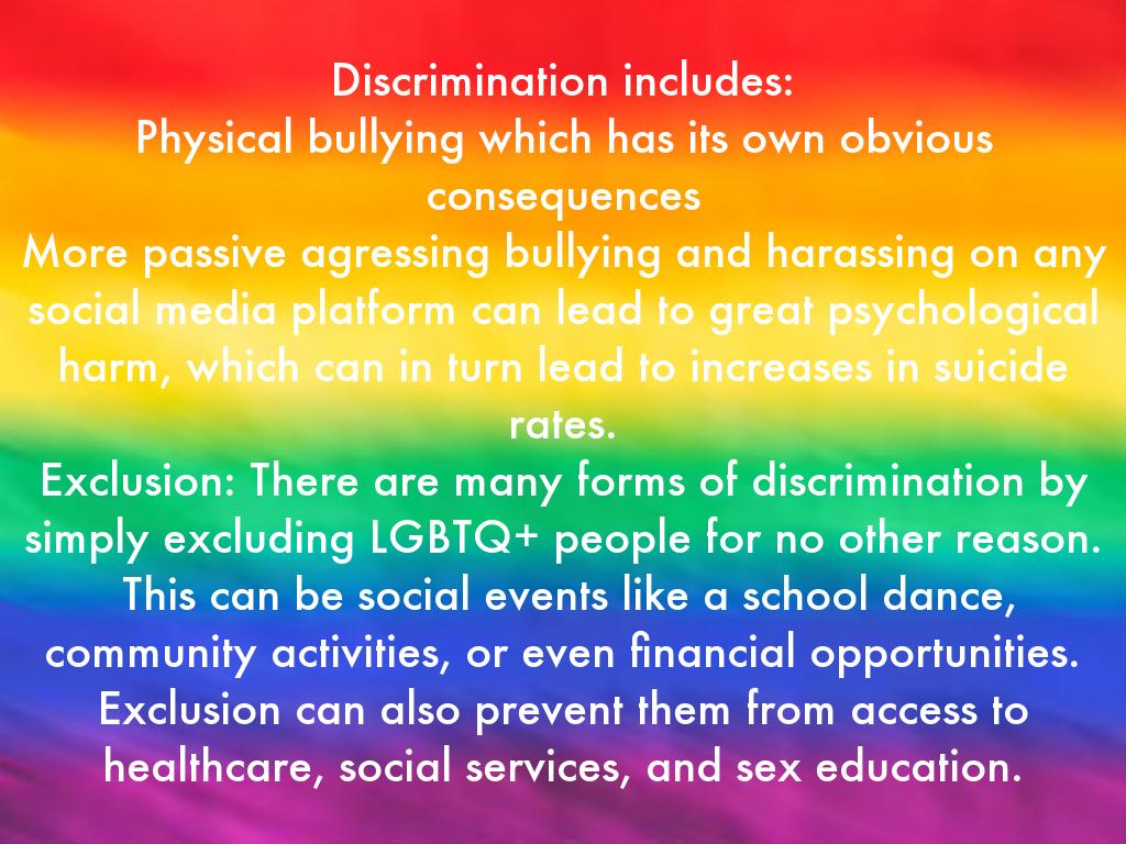 Exclusion: There are many forms of discrimination by simply excluding LGBTQ+ people for no other reason. This can be social events like a school dance, community activities, or even financial opportunities.