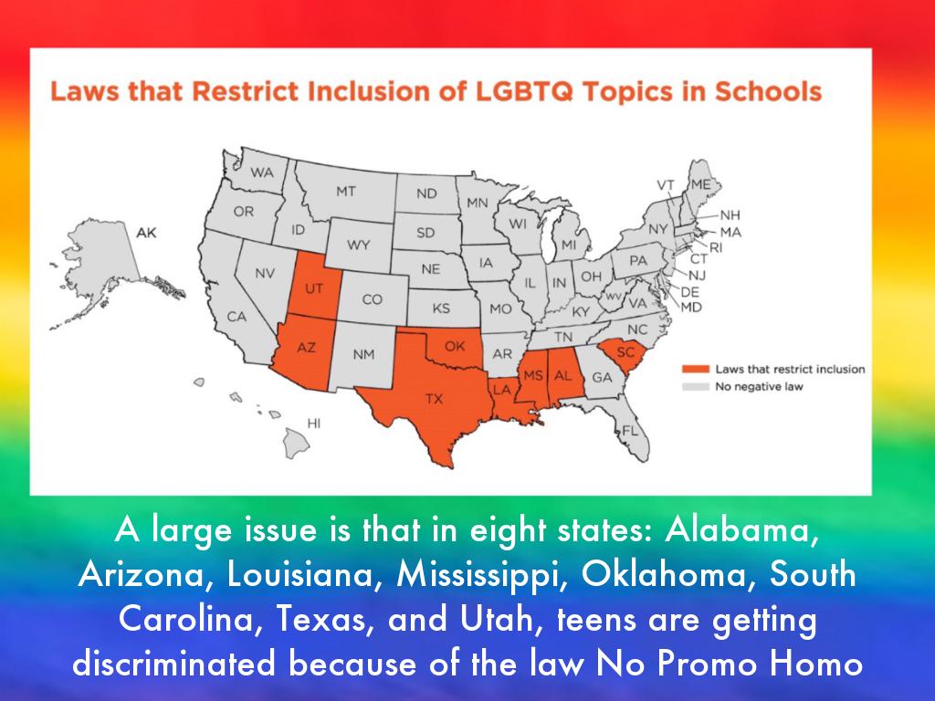 A large issue is that in eight states: Alabama, Arizona, Louisiana, Mississippi, Oklahoma, South Carolina, Texas, and Utah, teens are getting discriminated because of the law No Promo Homo