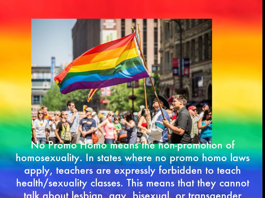 No Promo Homo means the non-promotion of homosexuality. In states where no promo homo laws apply, teachers are expressly forbidden to teach health/sexuality classes. This means that they cannot talk about lesbian, gay, bisexual, or transgender people or topics in a positive way, if at all. If teens declare themselves as LGBTQ+, they will be discriminated in many types of ways.