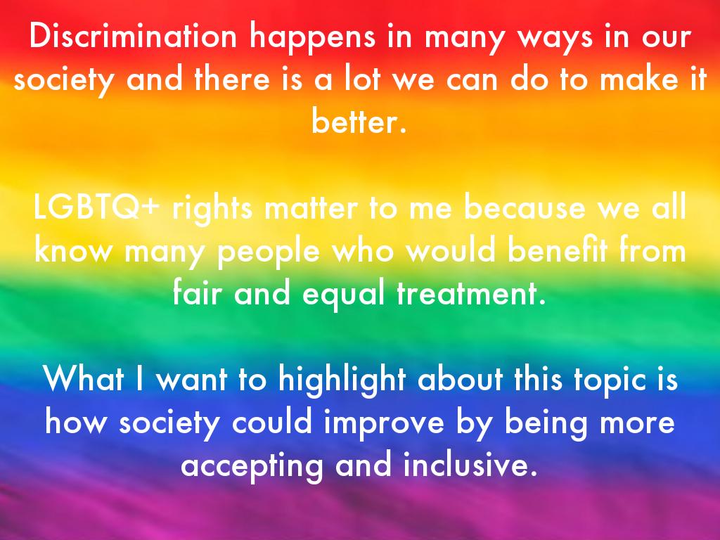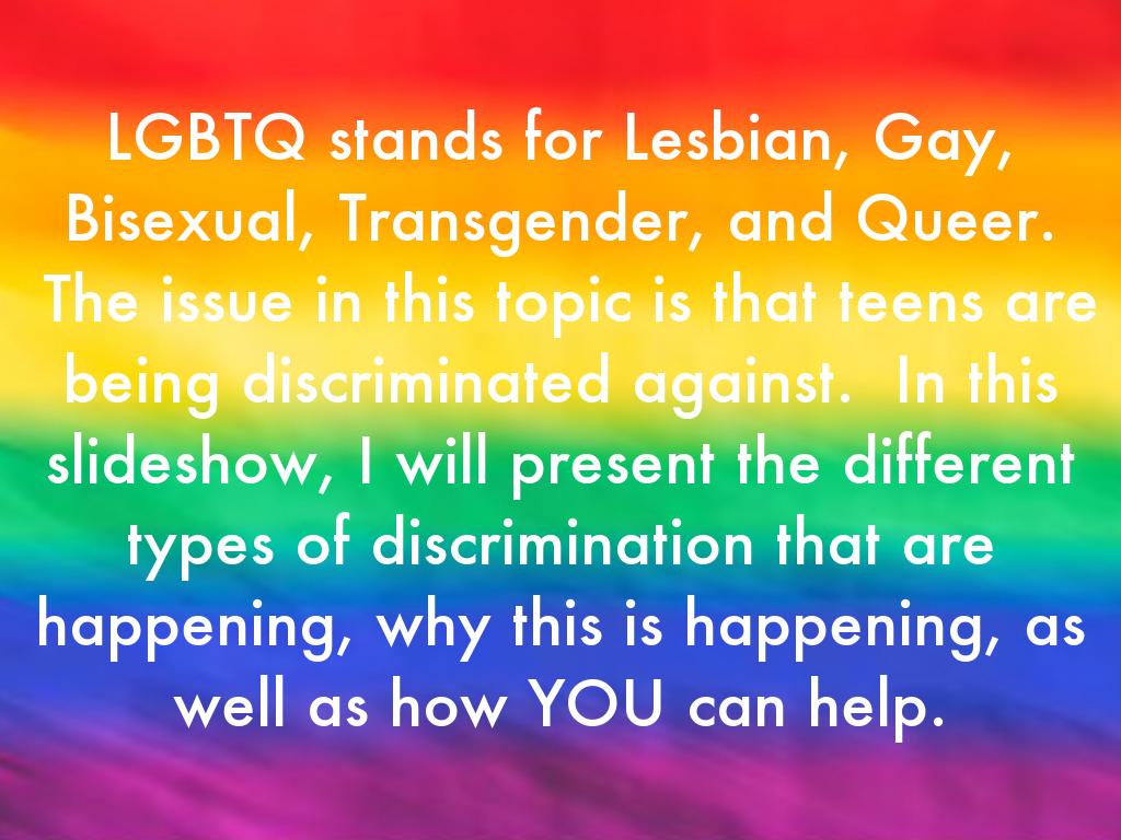 LGBTQ stands for Lesbian, Gay, Bisexual, Transgender, and Queer. The issue in this topic is that teens are being discriminated against. In this slideshow, I will present the different types of discrimination that are happening, why this is happening, as well as how YOU can help.
