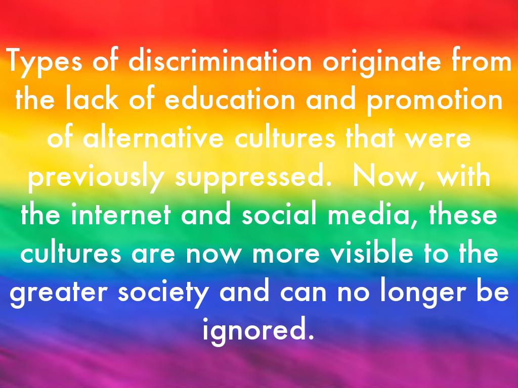 Types of discrimination originate from the lack of education and promotion of alternative cultures that were previously suppressed. Now, with the internet and social media, these cultures are now more visible to the greater society and can no longer be ignored.