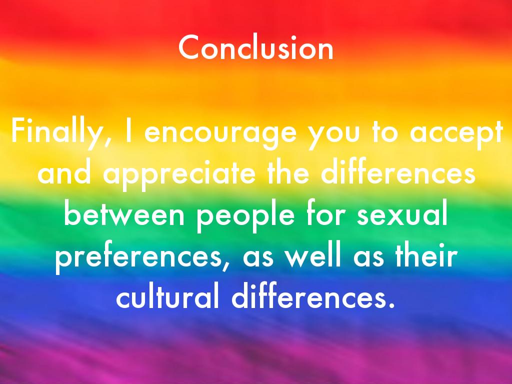 Finally, I encourage you to accept and appreciate the differences between people for sexual preferences, as well as their cultural differences.