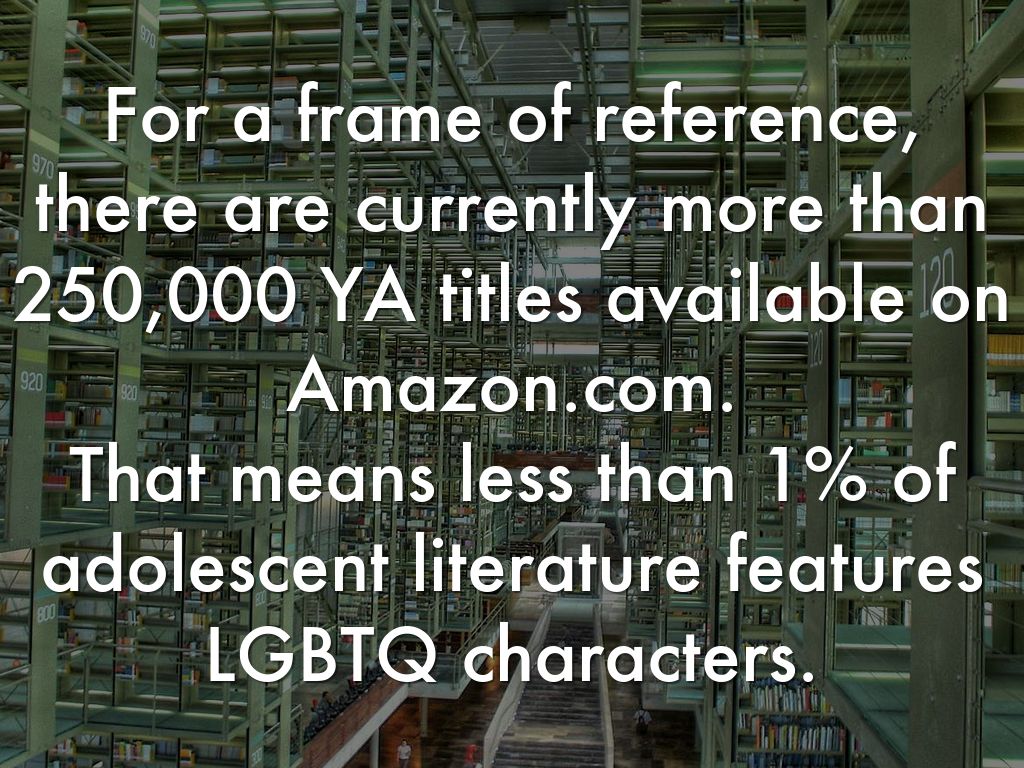 For a frame of reference, there are currently more than 250,000 YA titles available on Amazon.com. That means less than 1% of adolescent literature features LGBTQ characters.
