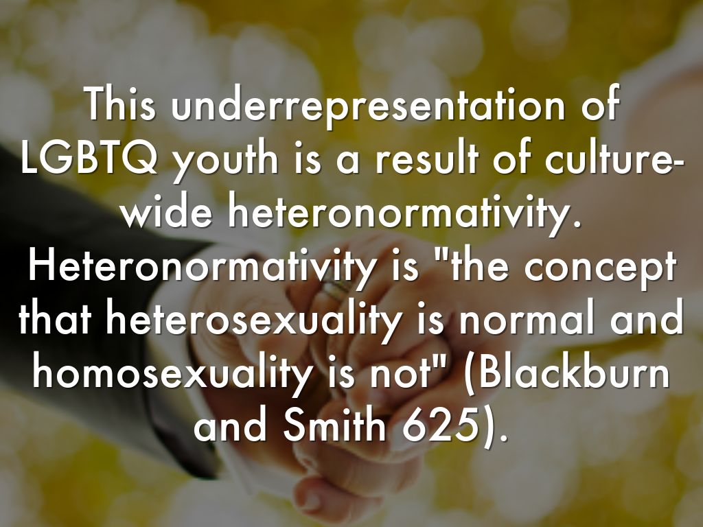 This underrepresentation of LGBTQ youth is a result of culture-wide heteronormativity. Heteronormativity is "the concept that heterosexuality is normal and homosexuality is not" (Blackburn and Smith 625).