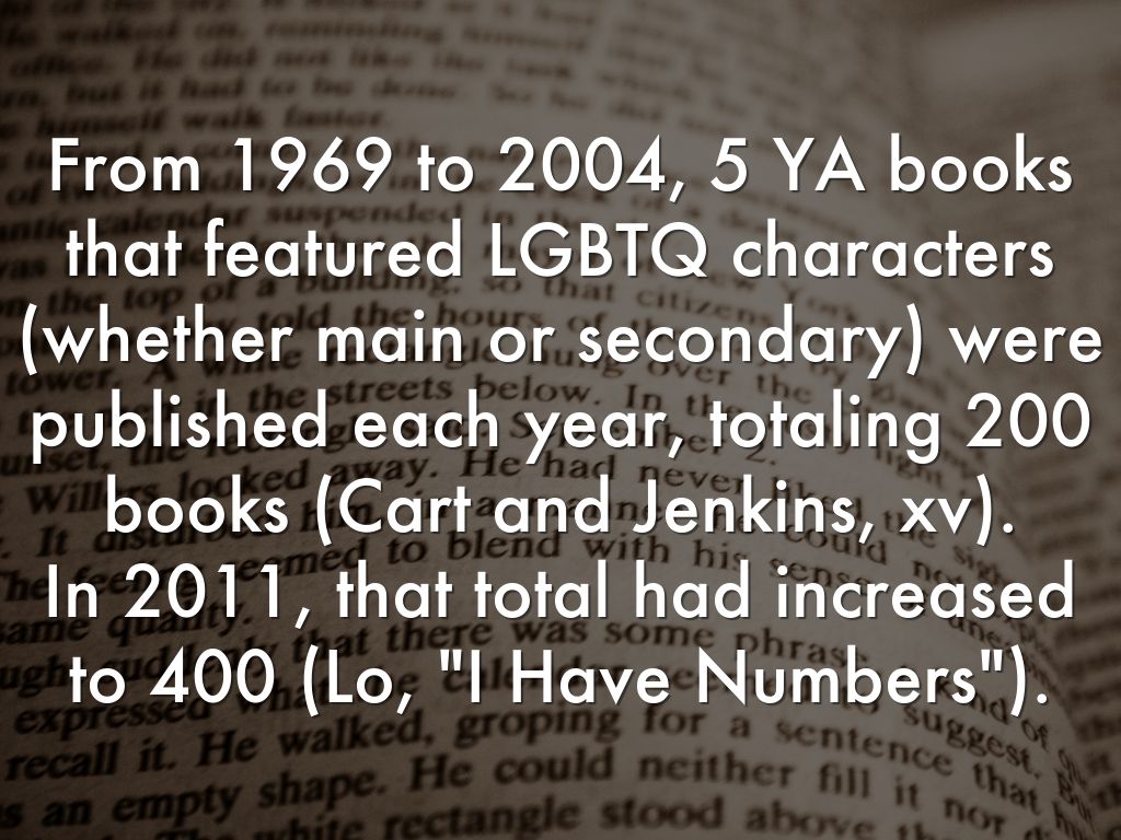 From 1969 to 2004, 5 YA books that featured LGBTQ characters (whether main or secondary) were published each year, totaling 200 books (Cart and Jenkins, xv). In 2011, that total had increased to 400 (Lo, "I Have Numbers").