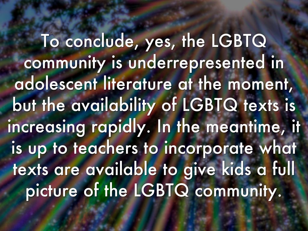 To conclude, yes, the LGBTQ community is underrepresented in adolescent literature at the moment, but the availability of LGBTQ texts is increasing rapidly. In the meantime, it is up to teachers to incorporate what texts are available to give kids a full picture of the LGBTQ community.
