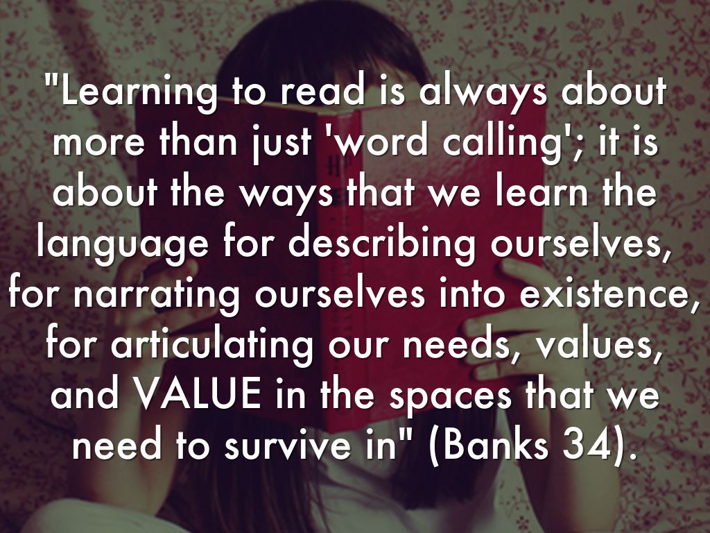 "Learning to read is always about more than just 'word calling'; it is about the ways that we learn the language for describing ourselves, for narrating ourselves into existence, for articulating our needs, values, and VALUE in the spaces that we need to survive in" (Banks 34).