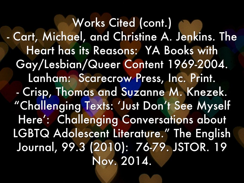 Works Cited (cont.) - Cart, Michael, and Christine A. Jenkins. The Heart has its Reasons: YA Books with Gay/Lesbian/Queer Content 1969-2004. Lanham: Scarecrow Press, Inc. Print. - Crisp, Thomas and Suzanne M. Knezek. “Challenging Texts: ‘Just Don’t See Myself Here’: Challenging Conversations about LGBTQ Adolescent Literature.” The English Journal, 99.3 (2010): 76-79. JSTOR. 19 Nov. 2014.